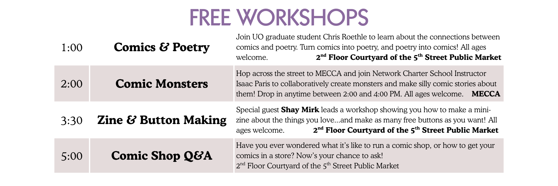 With guest artists, panels, workshops, and a whole alley full of amazing comics artists, CAFE is Eugene’s homegrown comics festival—welcoming to longtime fans and curious newcomers alike!